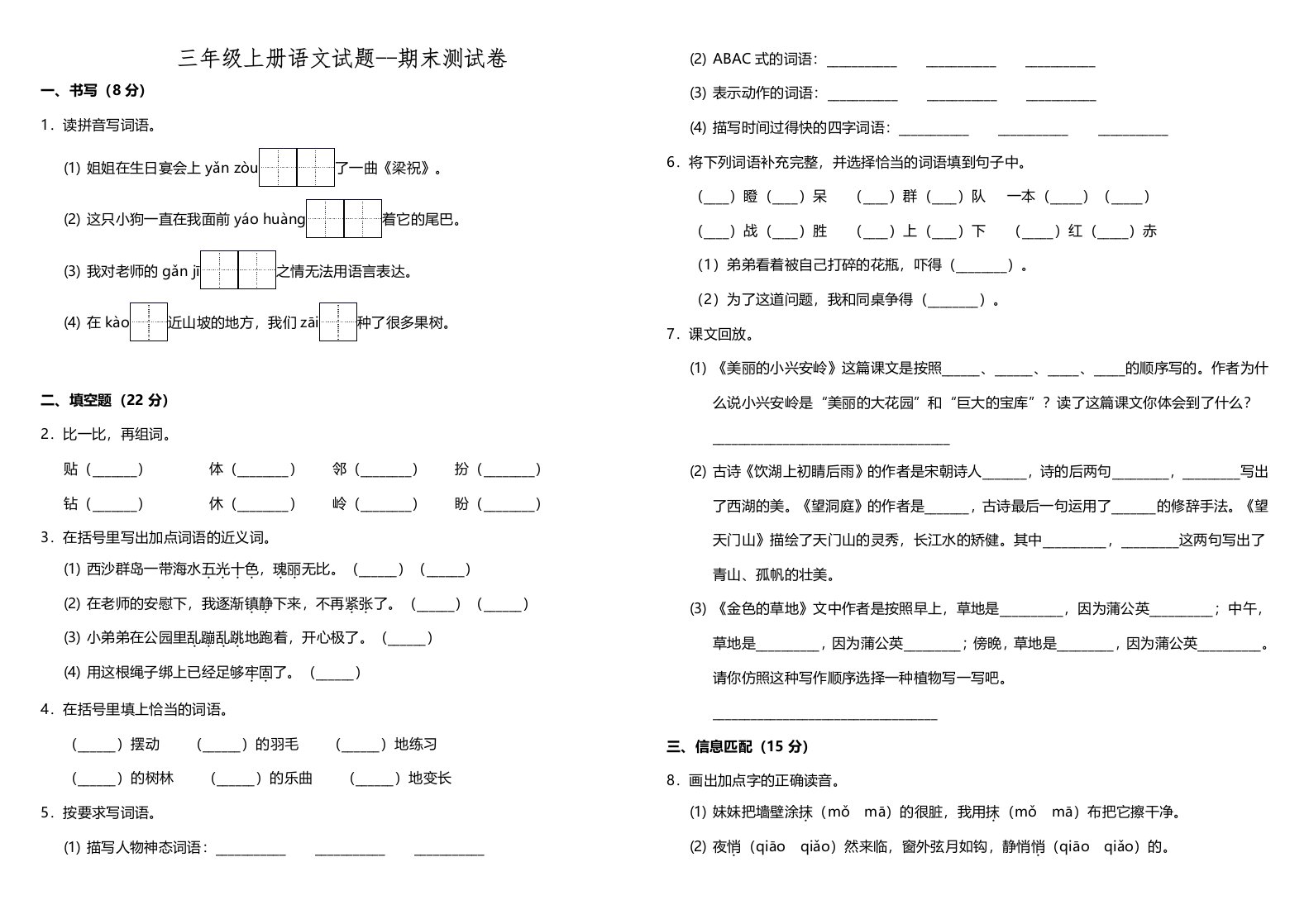 三年级语文上册(期末测试题)版(部编版)_共6页