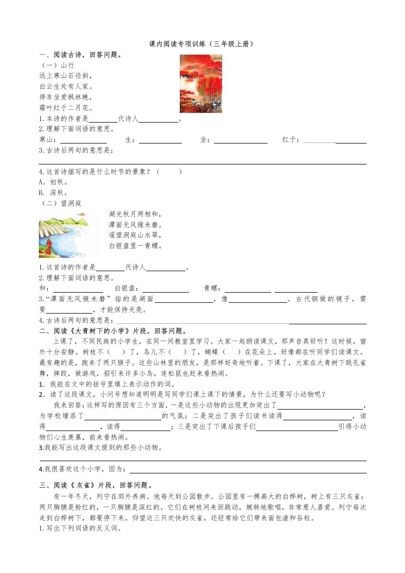 三年级语文上册4课内阅读专项练习题(部编版)_共10页