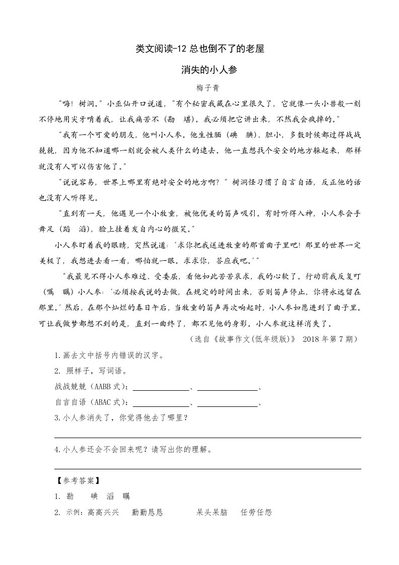 三年级语文上册类文阅读12总也倒不了的老屋(部编版)_共3页