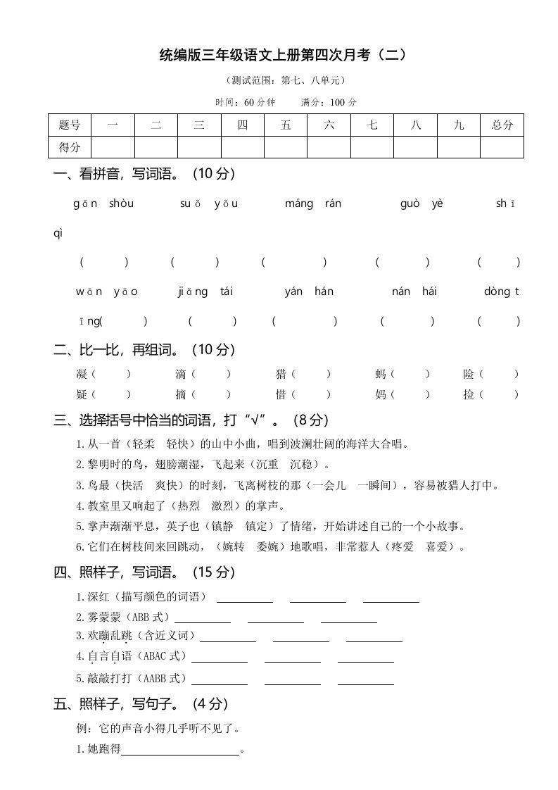 当前位置: 首页小学资源小学三年级正文 三年级语文上册第四次月考卷(二)(部编版)_共5页 小学三年级 1 周前 0 0 5 以上为部分内容预览,如需源文档请登录您的会员账号进行下载! 声明:本站所有文章,如无特殊说明或标注,均为本站原创发布。任何个人或组织,在未征得本站同意时,禁止复制、盗用、采集、发布本站内容到任何网站、书籍等各类媒体平台。如若本站内容侵犯了原著者的合法权益,可联系我们进行处理。 尚学资源永久会员 打赏 收藏 海报 链接