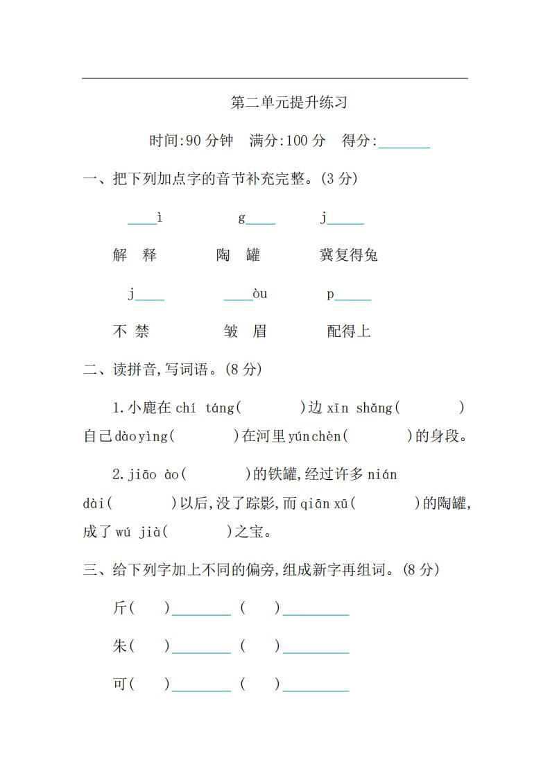 三年级语文上册第二单元提升练习(部编版)_共11页