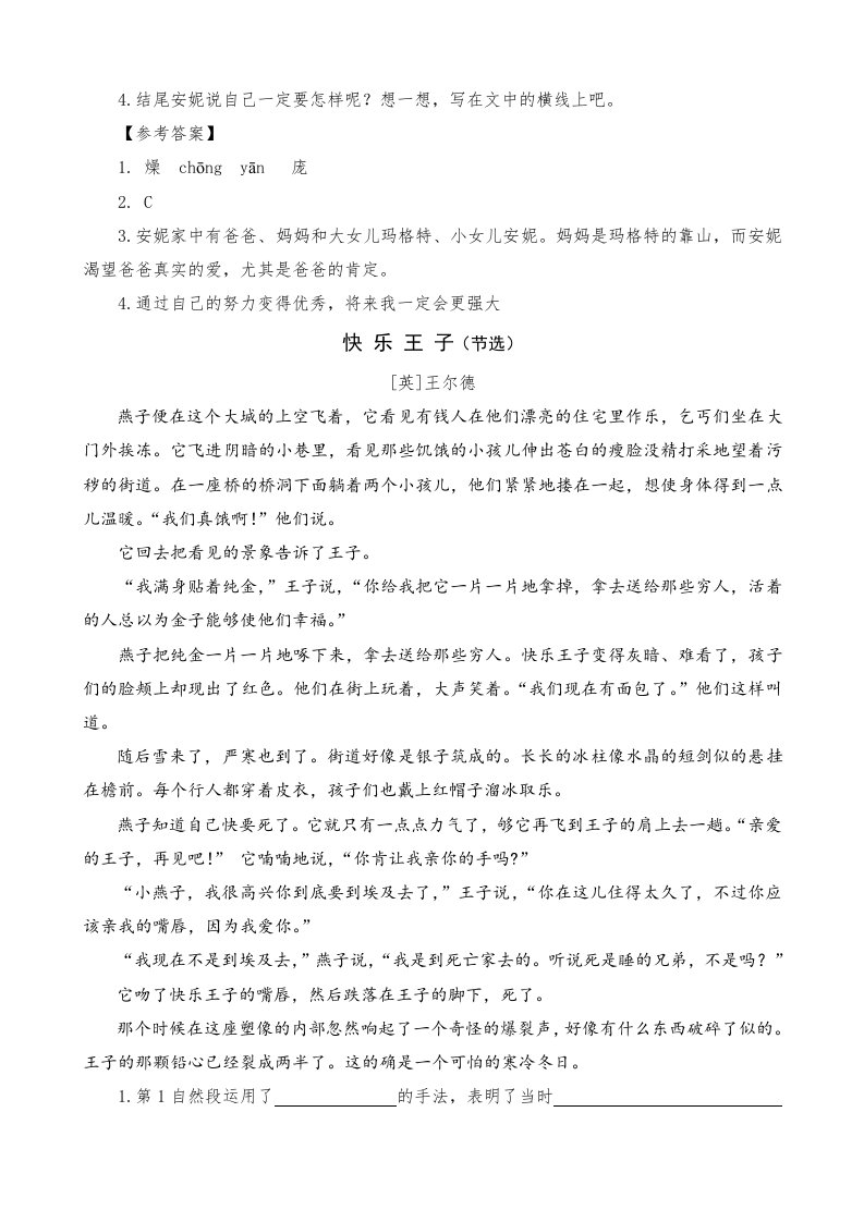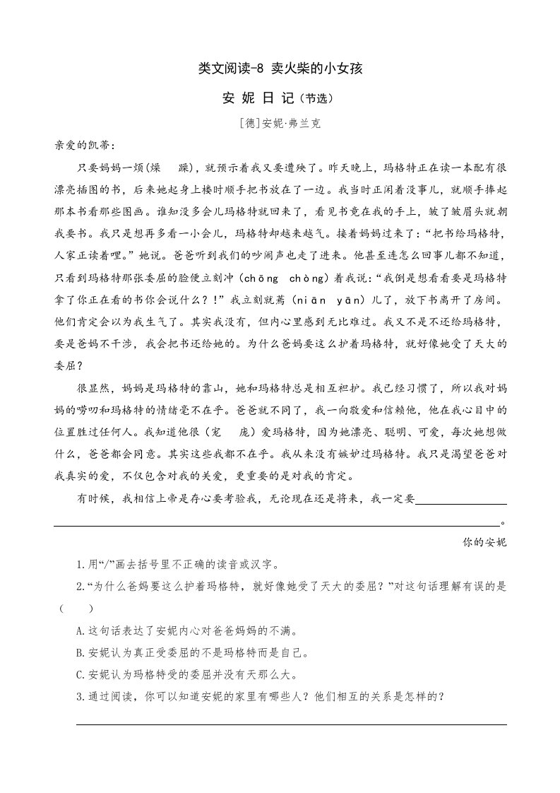 当前位置: 首页小学资源小学三年级正文 三年级语文上册类文阅读8卖火柴的小女孩(部编版)_共3页 小学三年级 1 周前 0 0 5 以上为部分内容预览,如需源文档请登录您的会员账号进行下载! 声明:本站所有文章,如无特殊说明或标注,均为本站原创发布。任何个人或组织,在未征得本站同意时,禁止复制、盗用、采集、发布本站内容到任何网站、书籍等各类媒体平台。如若本站内容侵犯了原著者的合法权益,可联系我们进行处理。 尚学资源永久会员 打赏 收藏 海报 链接