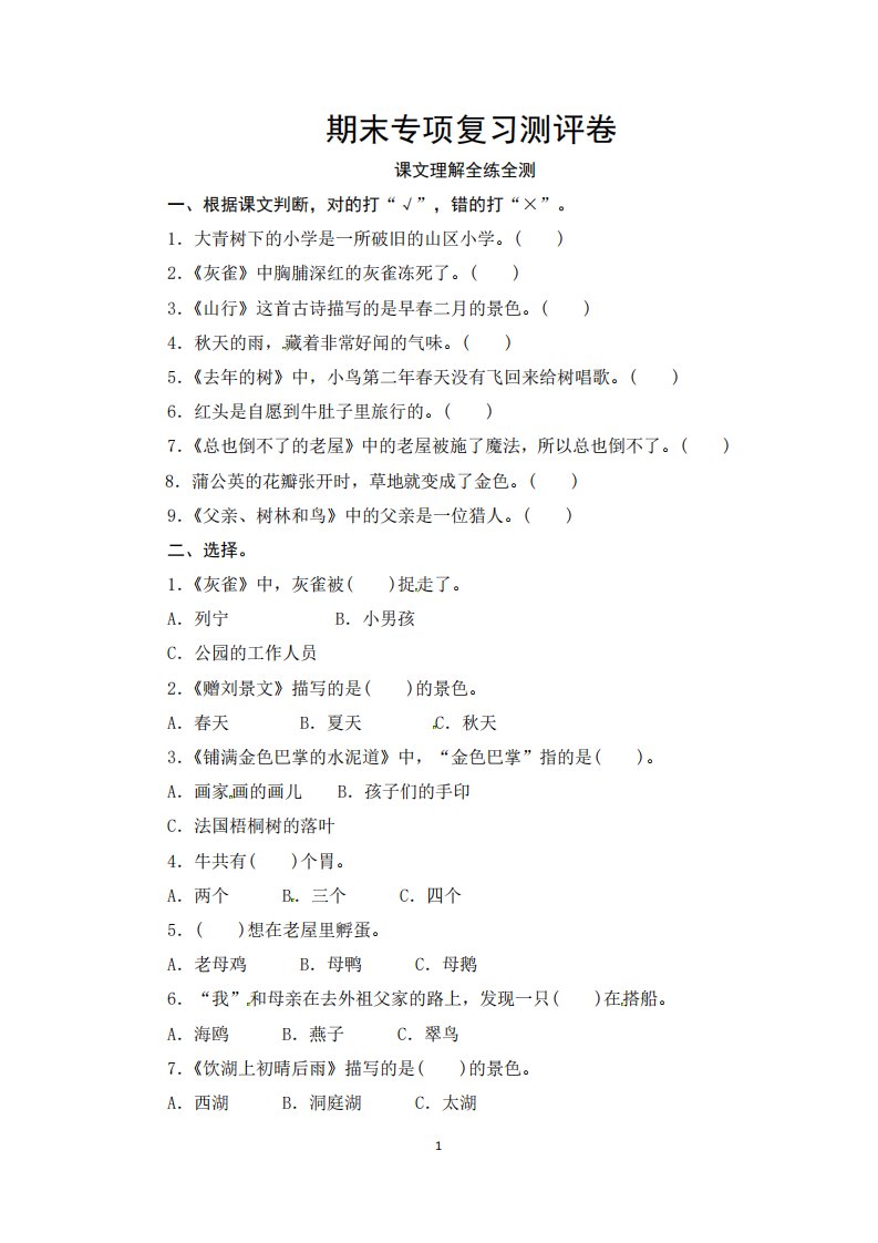 当前位置: 首页小学资源小学三年级正文 三年级语文上册期末课文理解专项复习测评卷(供打印3页)(部编版)_共3页 小学三年级 1 周前 0 0 5 以上为部分内容预览,如需源文档请登录您的会员账号进行下载! 声明:本站所有文章,如无特殊说明或标注,均为本站原创发布。任何个人或组织,在未征得本站同意时,禁止复制、盗用、采集、发布本站内容到任何网站、书籍等各类媒体平台。如若本站内容侵犯了原著者的合法权益,可联系我们进行处理。 尚学资源永久会员 打赏 收藏 海报 链接