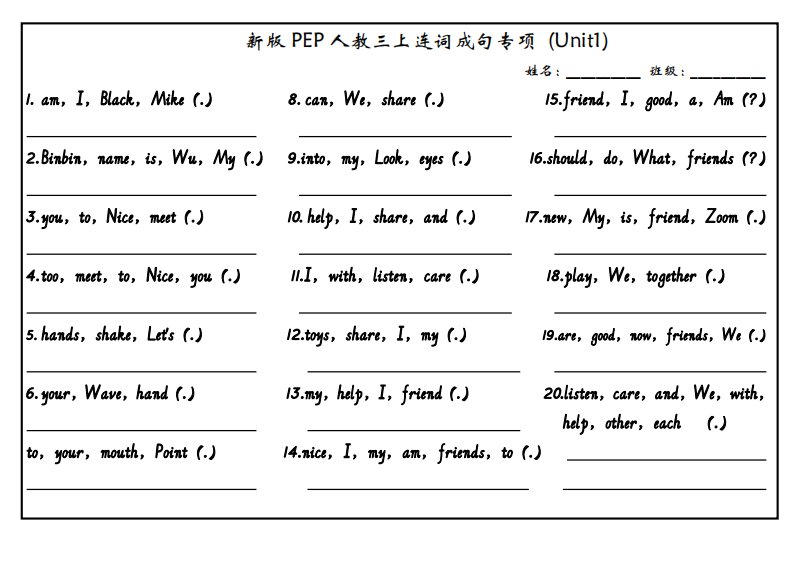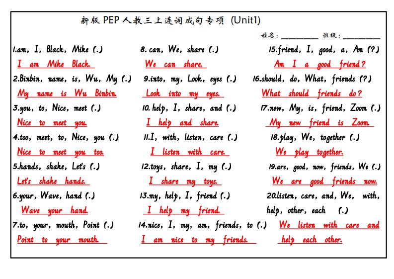 当前位置: 首页小学资源小学三年级正文 三上PEP英语连词成句(新版)_共12页 小学三年级 1 周前 0 0 10 以上为部分内容预览,如需源文档请登录您的会员账号进行下载! 声明:本站所有文章,如无特殊说明或标注,均为本站原创发布。任何个人或组织,在未征得本站同意时,禁止复制、盗用、采集、发布本站内容到任何网站、书籍等各类媒体平台。如若本站内容侵犯了原著者的合法权益,可联系我们进行处理。 尚学资源永久会员 打赏 收藏 海报 链接
