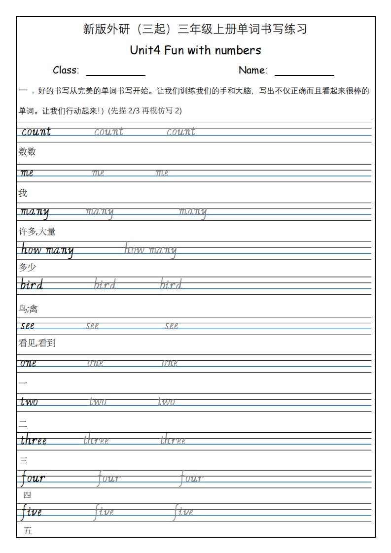 当前位置: 首页小学资源小学三年级正文 三上英语-(外研三起)Unit4Funwithmunbers单词书写练习_共3页 小学三年级 1 周前 0 0 5 以上为部分内容预览,如需源文档请登录您的会员账号进行下载! 声明:本站所有文章,如无特殊说明或标注,均为本站原创发布。任何个人或组织,在未征得本站同意时,禁止复制、盗用、采集、发布本站内容到任何网站、书籍等各类媒体平台。如若本站内容侵犯了原著者的合法权益,可联系我们进行处理。 尚学资源永久会员 打赏 收藏 海报 链接