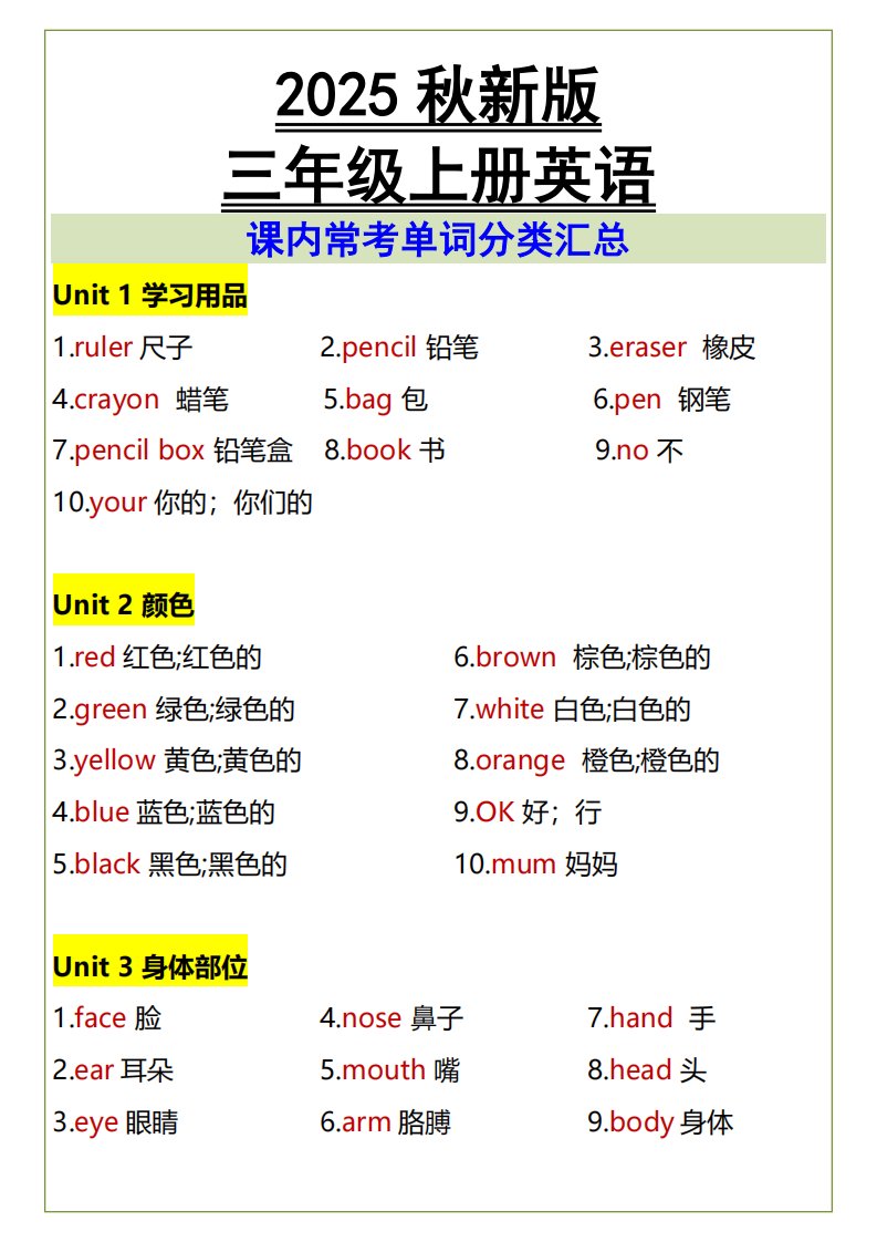 【2025秋新版】三年级上册英语课内常考单词分类汇总_共3页