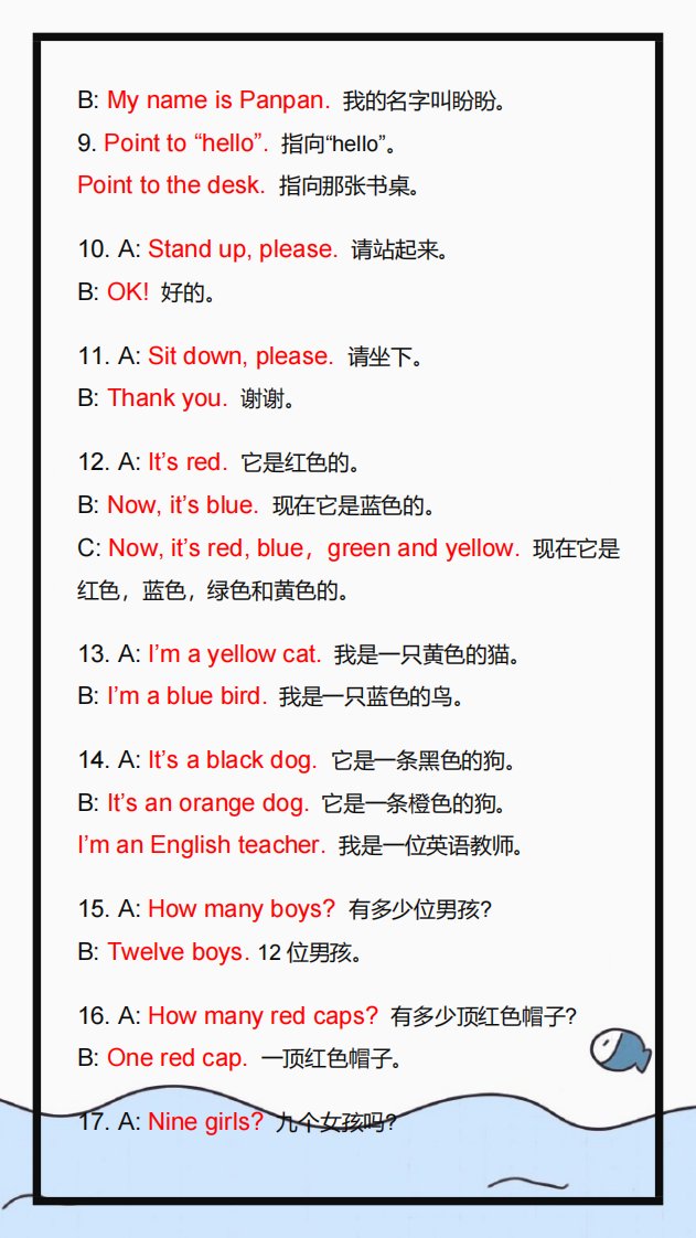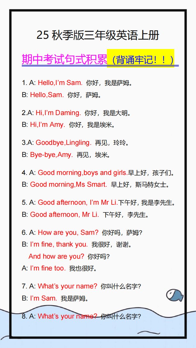 当前位置: 首页小学资源小学三年级正文 【2025秋新版】三年级英语上册期中考试句式积累,一定要掌握!_共5页 小学三年级 1 周前 0 0 5 以上为部分内容预览,如需源文档请登录您的会员账号进行下载! 声明:本站所有文章,如无特殊说明或标注,均为本站原创发布。任何个人或组织,在未征得本站同意时,禁止复制、盗用、采集、发布本站内容到任何网站、书籍等各类媒体平台。如若本站内容侵犯了原著者的合法权益,可联系我们进行处理。 尚学资源永久会员 打赏 收藏 海报 链接