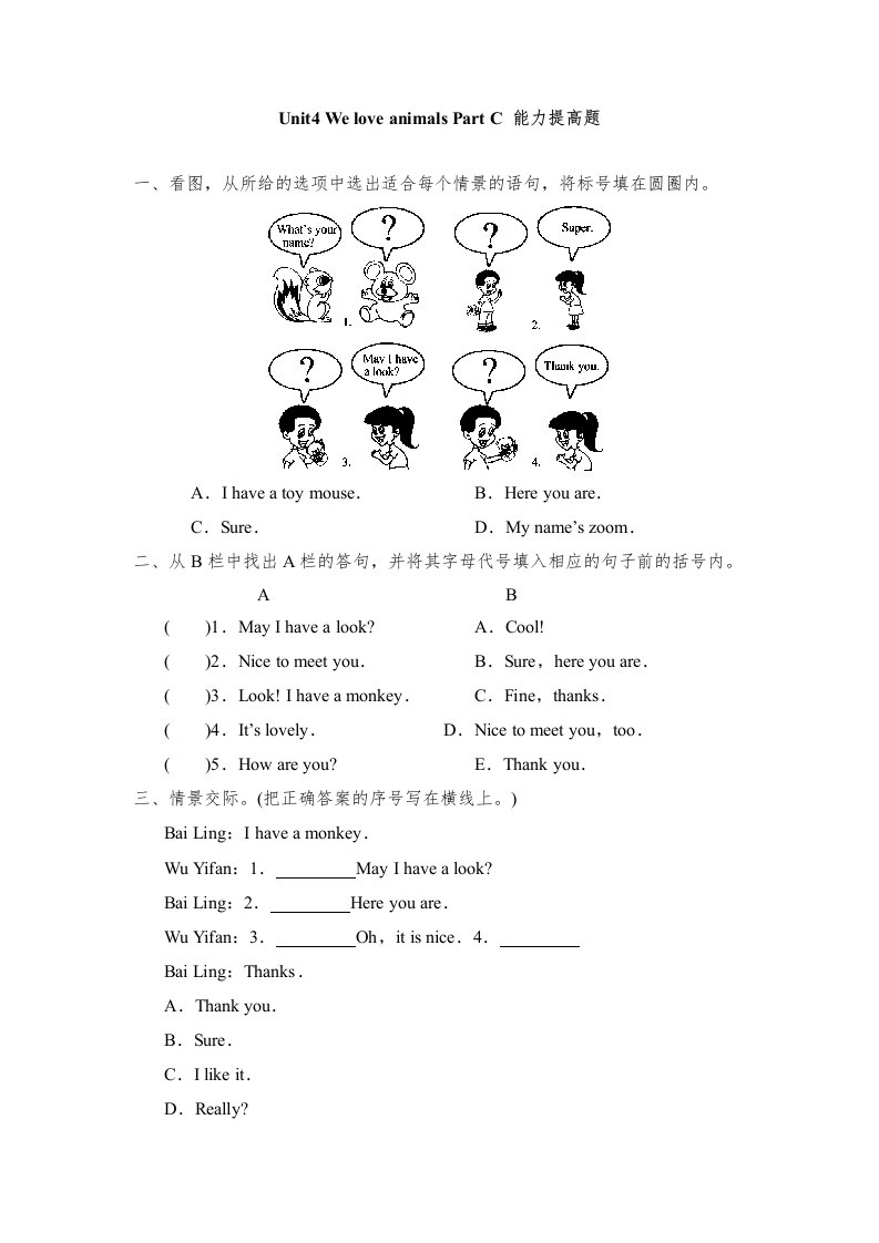 当前位置: 首页小学资源小学三年级正文 三年级英语上册Unit4Part__C能力提高题(人教PEP)_共4页 小学三年级 1 周前 0 0 5 以上为部分内容预览,如需源文档请登录您的会员账号进行下载! 声明:本站所有文章,如无特殊说明或标注,均为本站原创发布。任何个人或组织,在未征得本站同意时,禁止复制、盗用、采集、发布本站内容到任何网站、书籍等各类媒体平台。如若本站内容侵犯了原著者的合法权益,可联系我们进行处理。 尚学资源永久会员 打赏 收藏 海报 链接