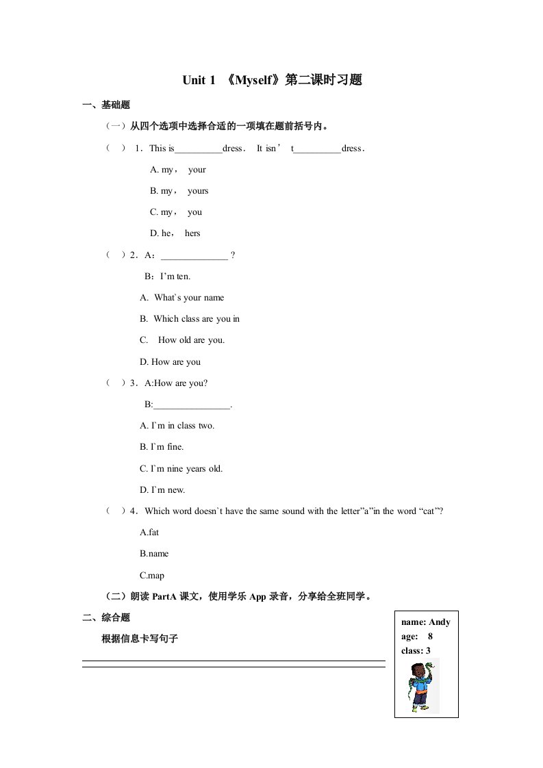 三年级英语上册Unit1《Myself》习题第2课时(人教版一起点)_共3页