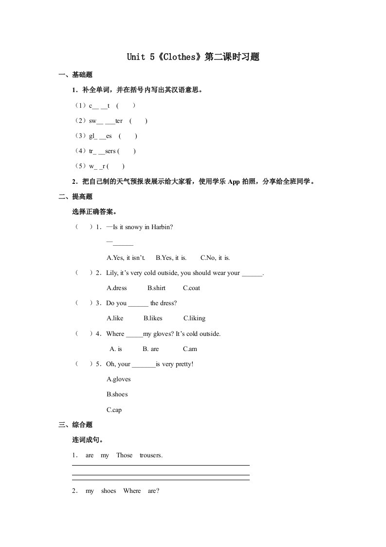三年级英语上册Unit5习题第2课时(人教版一起点)_共3页
