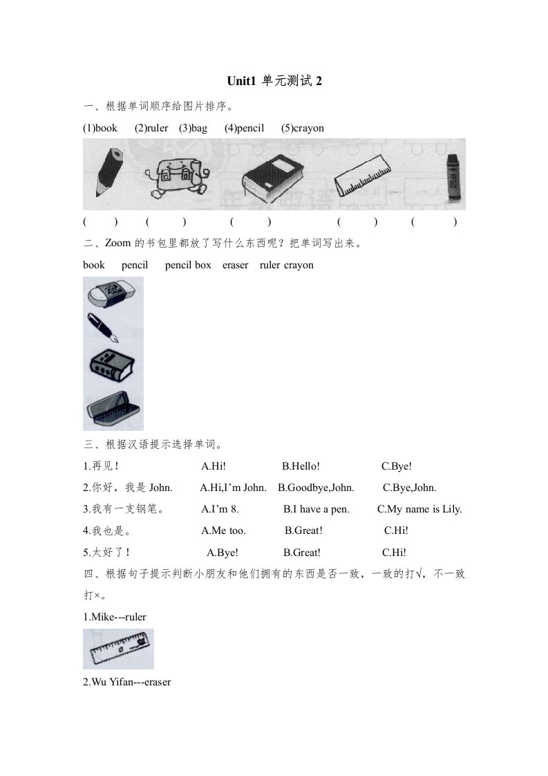 三年级英语上册Unit1单元测试【2】及答案(人教PEP)_共9页