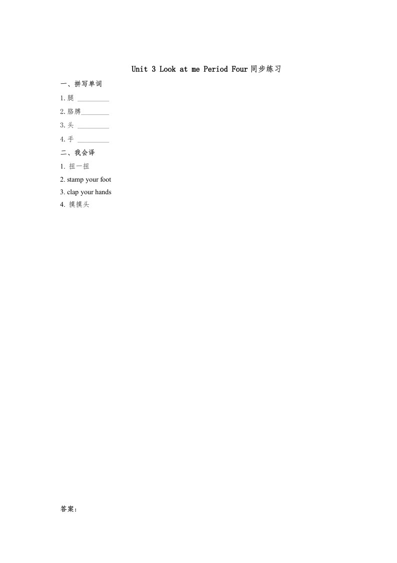 当前位置: 首页小学资源小学三年级正文 三年级英语上册Unit3《Lookatme!》第4课时同步练习(人教PEP)_共2页 小学三年级 1 周前 0 0 5 以上为部分内容预览,如需源文档请登录您的会员账号进行下载! 声明:本站所有文章,如无特殊说明或标注,均为本站原创发布。任何个人或组织,在未征得本站同意时,禁止复制、盗用、采集、发布本站内容到任何网站、书籍等各类媒体平台。如若本站内容侵犯了原著者的合法权益,可联系我们进行处理。 尚学资源永久会员 打赏 收藏 海报 链接