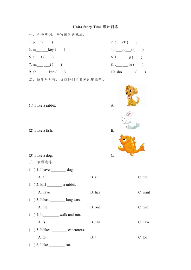 三年级英语上册Unit4_Story_Time课时训练(人教版一起点)_共3页