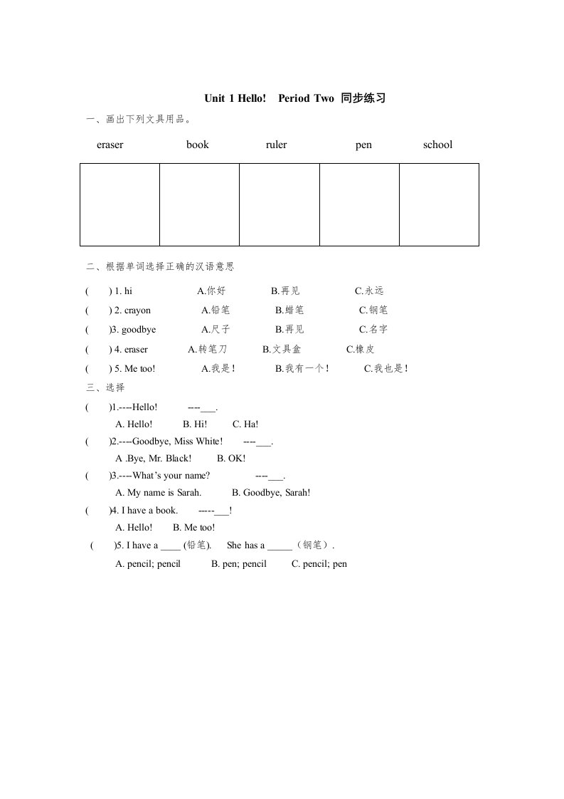 三年级英语上册unit1《Hello》第2课时同步练习(人教PEP)_共2页