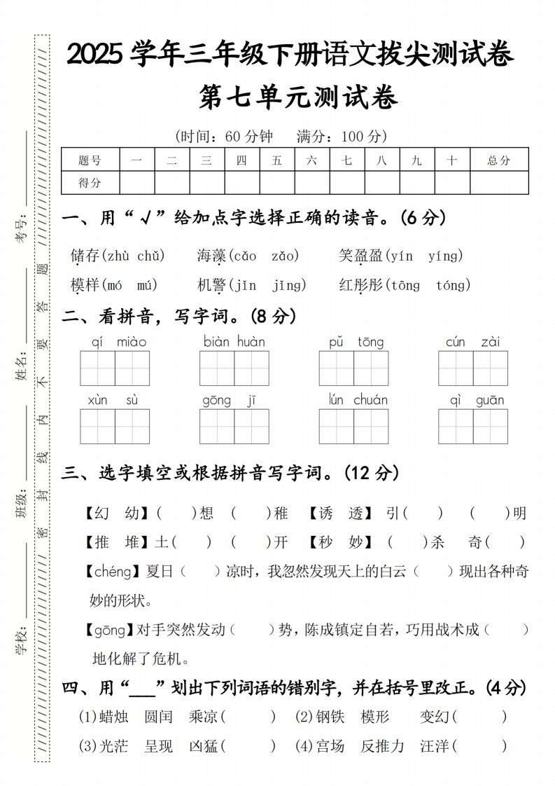 2025学年三年级下册语文拔尖测试卷第七单元_共4页