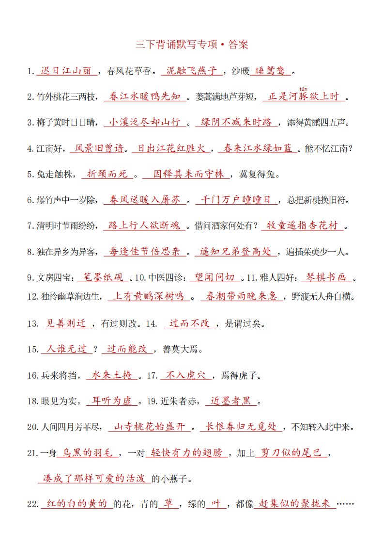 当前位置: 首页小学资源小学三年级正文 三下语文期末复习九大专项答案_共27页 小学三年级 1 周前 0 0 15 以上为部分内容预览,如需源文档请登录您的会员账号进行下载! 声明:本站所有文章,如无特殊说明或标注,均为本站原创发布。任何个人或组织,在未征得本站同意时,禁止复制、盗用、采集、发布本站内容到任何网站、书籍等各类媒体平台。如若本站内容侵犯了原著者的合法权益,可联系我们进行处理。 尚学资源永久会员 打赏 收藏 海报 链接