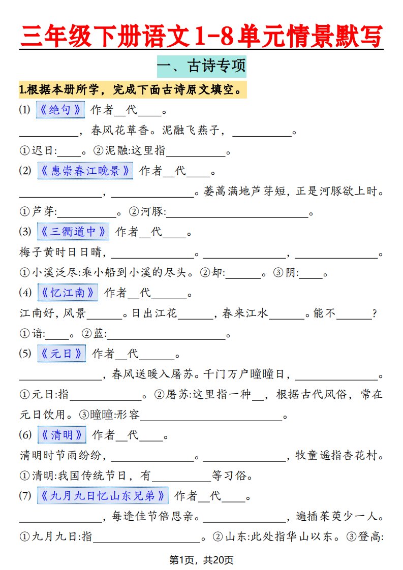 当前位置: 首页小学资源小学三年级正文 三下语文【1-8单元情景默写20页(空白)】_共20页 小学三年级 1 周前 0 0 10 以上为部分内容预览,如需源文档请登录您的会员账号进行下载! 声明:本站所有文章,如无特殊说明或标注,均为本站原创发布。任何个人或组织,在未征得本站同意时,禁止复制、盗用、采集、发布本站内容到任何网站、书籍等各类媒体平台。如若本站内容侵犯了原著者的合法权益,可联系我们进行处理。 尚学资源永久会员 打赏 收藏 海报 链接