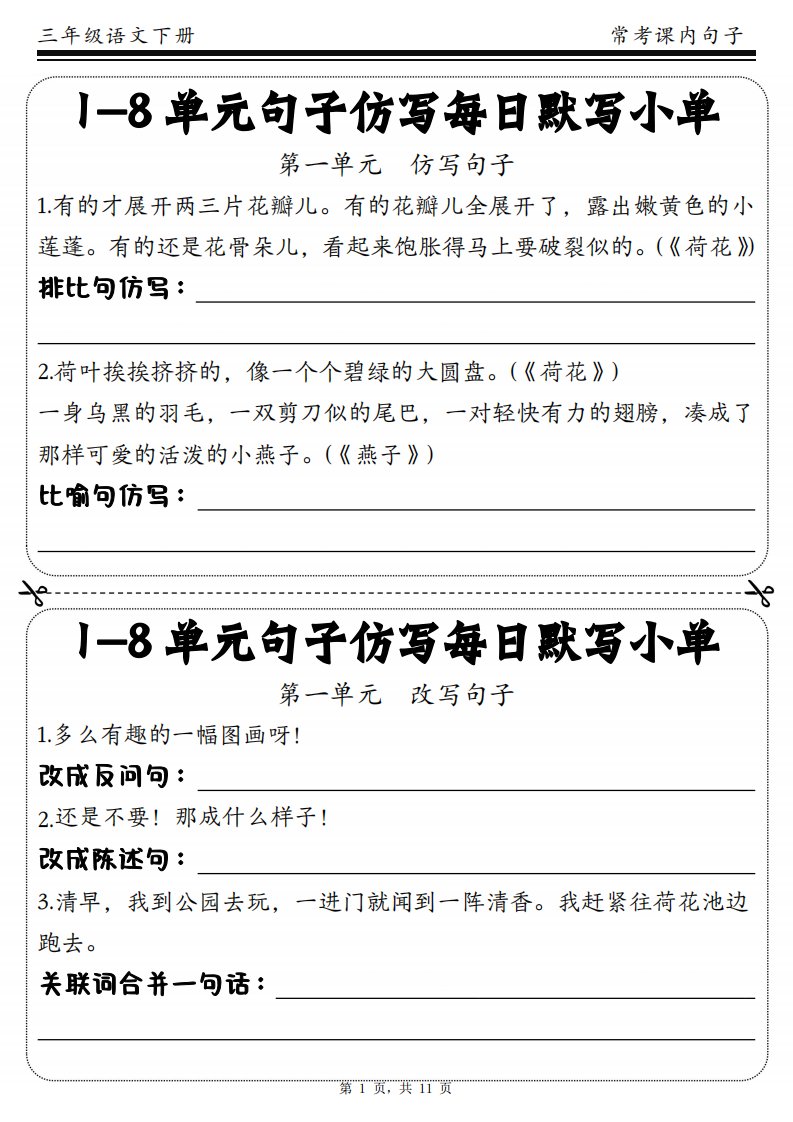 当前位置: 首页小学资源小学三年级正文 三下语文1-8单元课文句子仿写每日小单(含答案11页)_共11页 小学三年级 1 周前 0 0 10 以上为部分内容预览,如需源文档请登录您的会员账号进行下载! 声明:本站所有文章,如无特殊说明或标注,均为本站原创发布。任何个人或组织,在未征得本站同意时,禁止复制、盗用、采集、发布本站内容到任何网站、书籍等各类媒体平台。如若本站内容侵犯了原著者的合法权益,可联系我们进行处理。 尚学资源永久会员 打赏 收藏 海报 链接