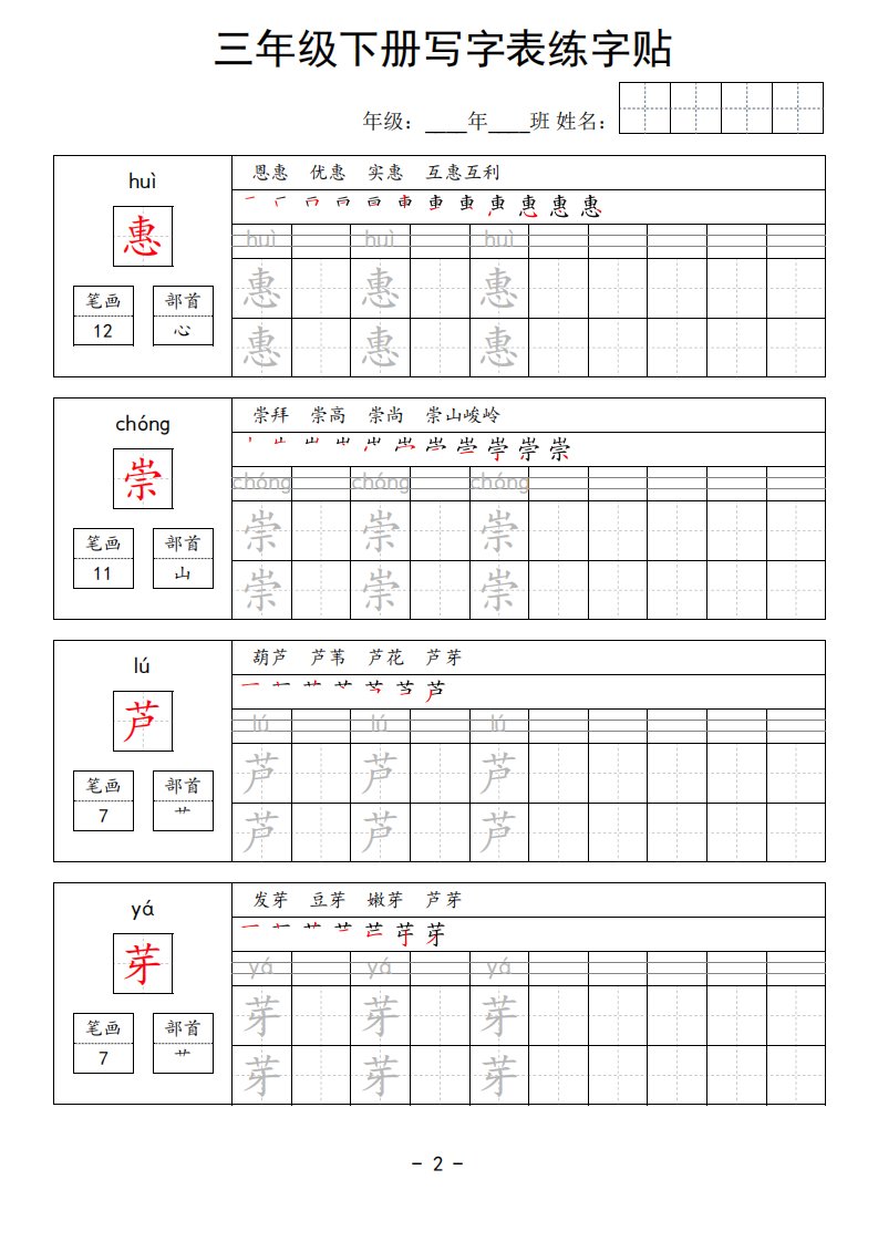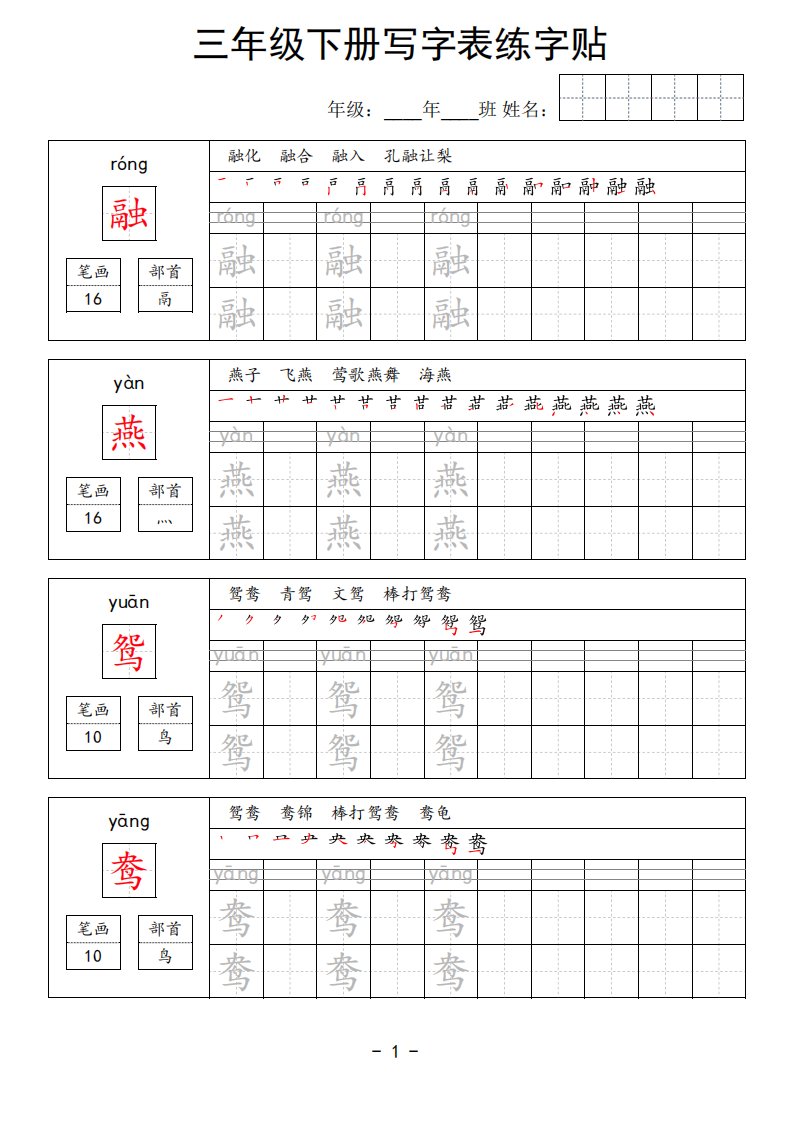 当前位置: 首页小学资源小学三年级正文 三年级下册语文写字表练字贴(拼音笔画笔顺组词)63页_共63页 小学三年级 1 周前 0 0 15 以上为部分内容预览,如需源文档请登录您的会员账号进行下载! 声明:本站所有文章,如无特殊说明或标注,均为本站原创发布。任何个人或组织,在未征得本站同意时,禁止复制、盗用、采集、发布本站内容到任何网站、书籍等各类媒体平台。如若本站内容侵犯了原著者的合法权益,可联系我们进行处理。 尚学资源永久会员 打赏 收藏 海报 链接