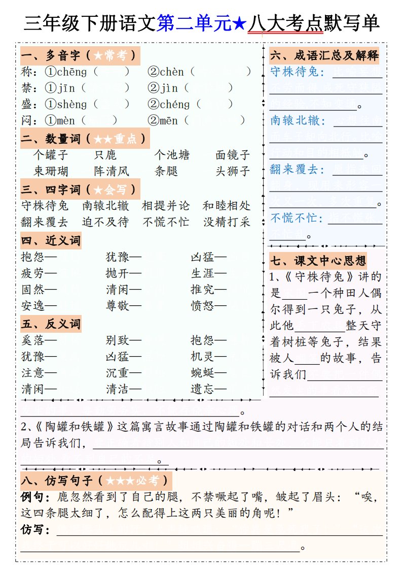当前位置: 首页小学资源小学三年级正文 【默写单】三下语文1-8单元八大考点默写单(含答案16页)_共16页 小学三年级 1 周前 0 0 10 以上为部分内容预览,如需源文档请登录您的会员账号进行下载! 声明:本站所有文章,如无特殊说明或标注,均为本站原创发布。任何个人或组织,在未征得本站同意时,禁止复制、盗用、采集、发布本站内容到任何网站、书籍等各类媒体平台。如若本站内容侵犯了原著者的合法权益,可联系我们进行处理。 尚学资源永久会员 打赏 收藏 海报 链接