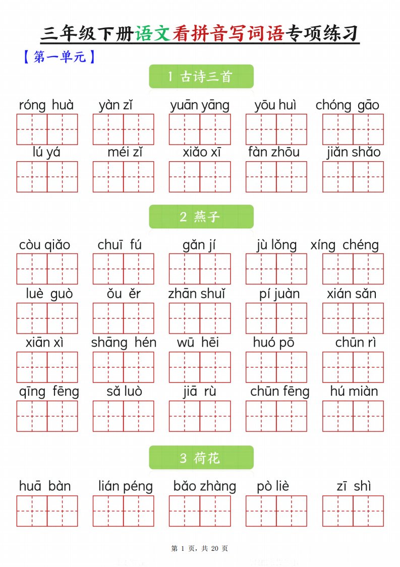 当前位置: 首页小学资源小学三年级正文 【词语专项】三下语文看拼音写词语专项练习(含答案20页)_共20页 小学三年级 1 周前 0 0 10 以上为部分内容预览,如需源文档请登录您的会员账号进行下载! 声明:本站所有文章,如无特殊说明或标注,均为本站原创发布。任何个人或组织,在未征得本站同意时,禁止复制、盗用、采集、发布本站内容到任何网站、书籍等各类媒体平台。如若本站内容侵犯了原著者的合法权益,可联系我们进行处理。 尚学资源永久会员 打赏 收藏 海报 链接