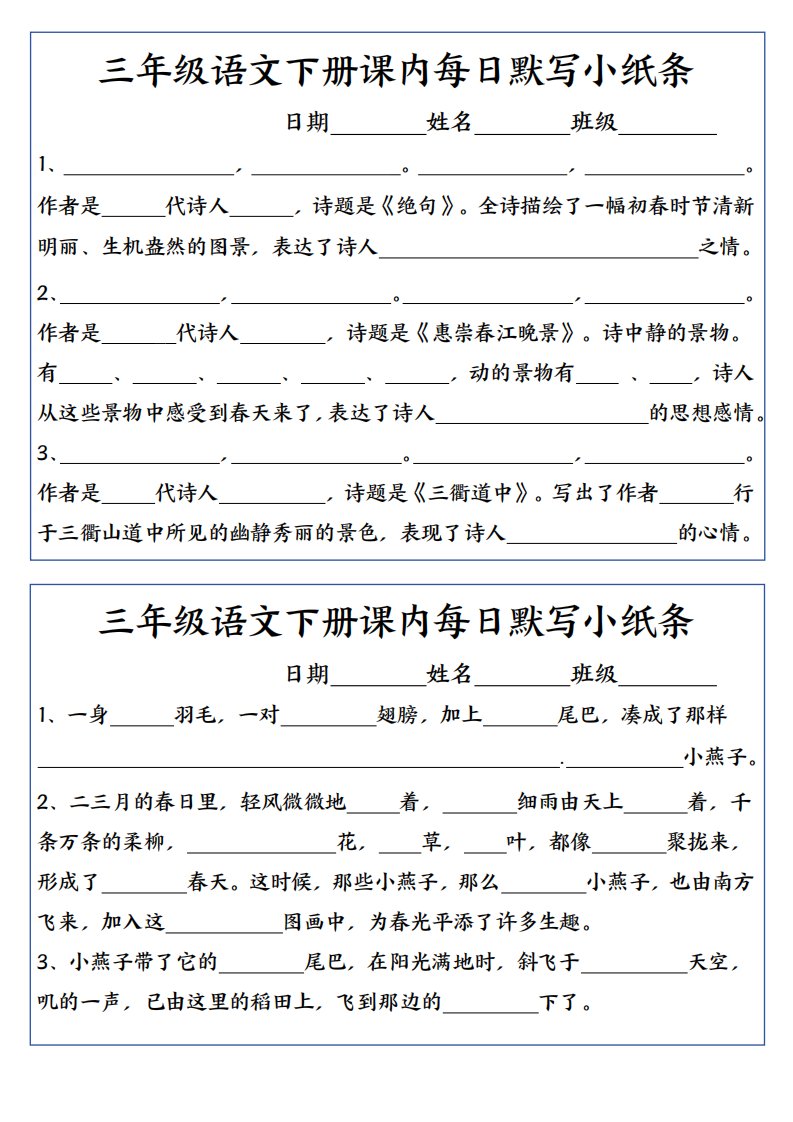 当前位置: 首页小学资源小学三年级正文 三年级下册语文全册每课默写小纸条_共4页 小学三年级 1 周前 0 0 5 以上为部分内容预览,如需源文档请登录您的会员账号进行下载! 声明:本站所有文章,如无特殊说明或标注,均为本站原创发布。任何个人或组织,在未征得本站同意时,禁止复制、盗用、采集、发布本站内容到任何网站、书籍等各类媒体平台。如若本站内容侵犯了原著者的合法权益,可联系我们进行处理。 尚学资源永久会员 打赏 收藏 海报 链接