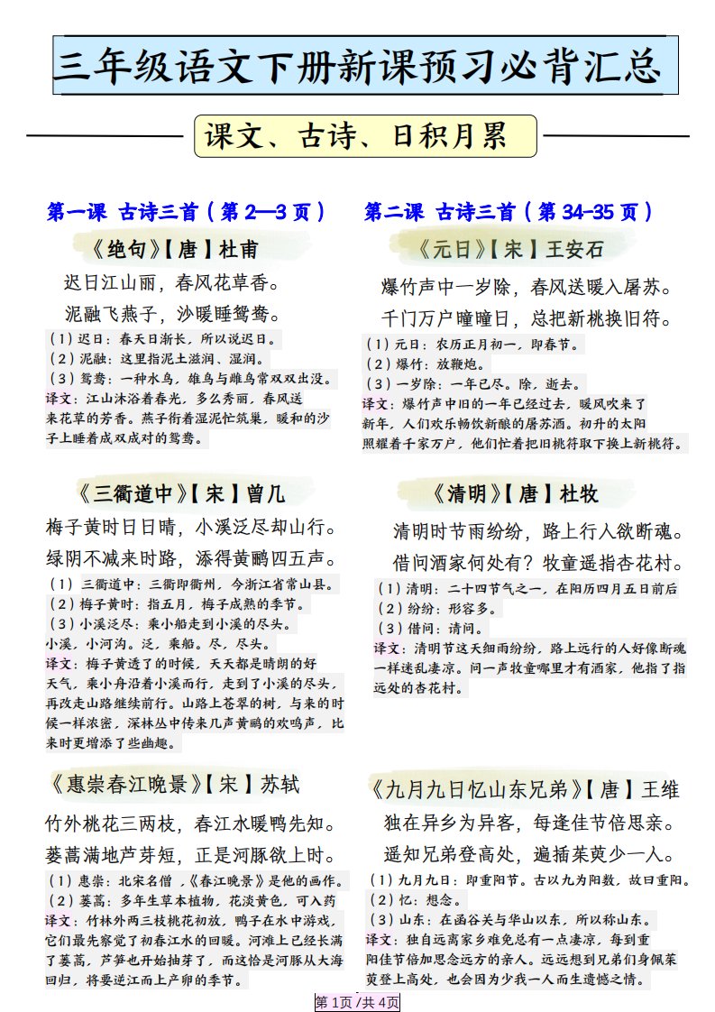 当前位置: 首页小学资源小学三年级正文 三下语文【寒假预习】必背汇总(课文、古诗、日积月累)4页_共4页 小学三年级 7 天前 0 0 5 以上为部分内容预览,如需源文档请登录您的会员账号进行下载! 声明:本站所有文章,如无特殊说明或标注,均为本站原创发布。任何个人或组织,在未征得本站同意时,禁止复制、盗用、采集、发布本站内容到任何网站、书籍等各类媒体平台。如若本站内容侵犯了原著者的合法权益,可联系我们进行处理。 尚学资源永久会员 打赏 收藏 海报 链接