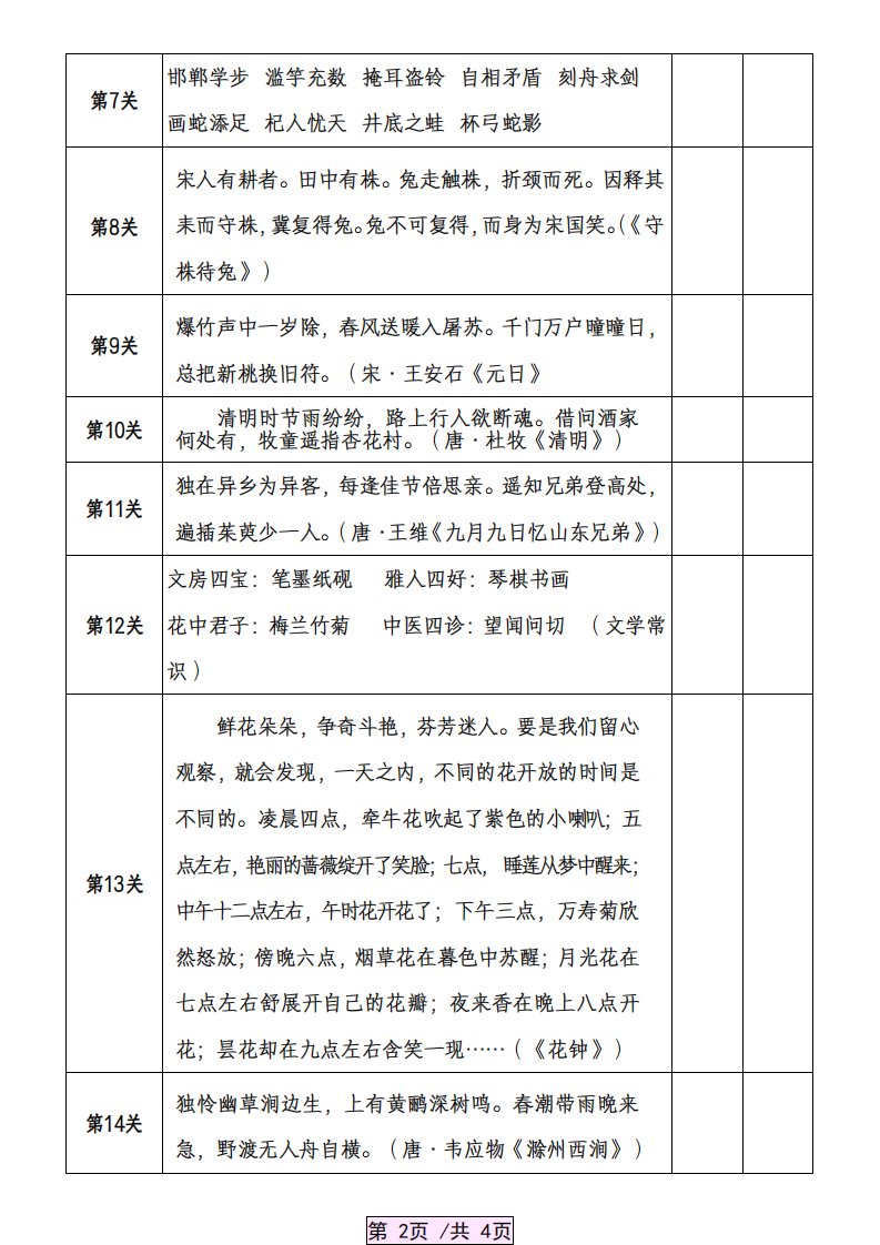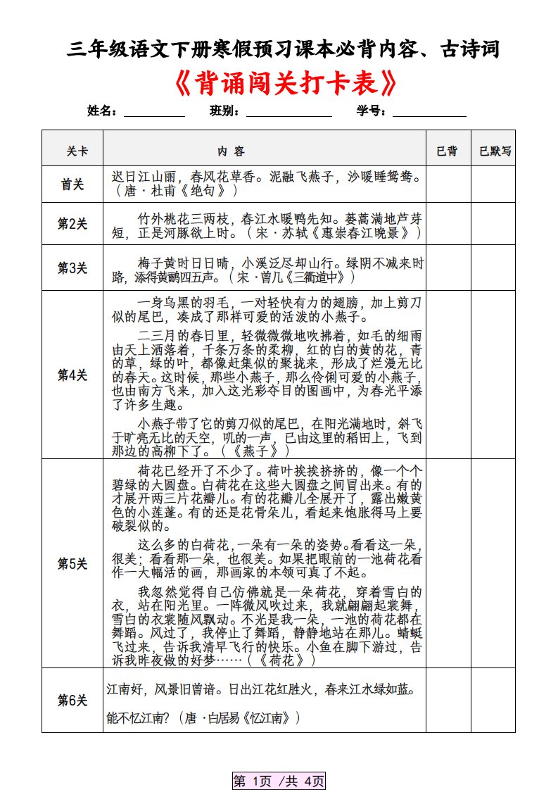 当前位置: 首页小学资源小学三年级正文 三下语文寒假预习:课本必背内容、古诗词及国学内容《背诵闯关表》_共4页 小学三年级 7 天前 0 0 5 以上为部分内容预览,如需源文档请登录您的会员账号进行下载! 声明:本站所有文章,如无特殊说明或标注,均为本站原创发布。任何个人或组织,在未征得本站同意时,禁止复制、盗用、采集、发布本站内容到任何网站、书籍等各类媒体平台。如若本站内容侵犯了原著者的合法权益,可联系我们进行处理。 尚学资源永久会员 打赏 收藏 海报 链接