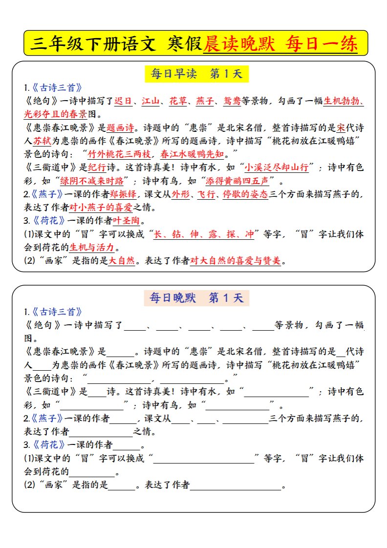 当前位置: 首页小学资源小学三年级正文 三下语文寒假预习必背-每日早读晚默(9天进阶版)_共10页 小学三年级 7 天前 0 0 5 以上为部分内容预览,如需源文档请登录您的会员账号进行下载! 声明:本站所有文章,如无特殊说明或标注,均为本站原创发布。任何个人或组织,在未征得本站同意时,禁止复制、盗用、采集、发布本站内容到任何网站、书籍等各类媒体平台。如若本站内容侵犯了原著者的合法权益,可联系我们进行处理。 尚学资源永久会员 打赏 收藏 海报 链接