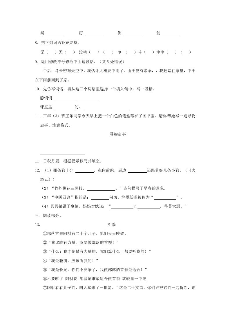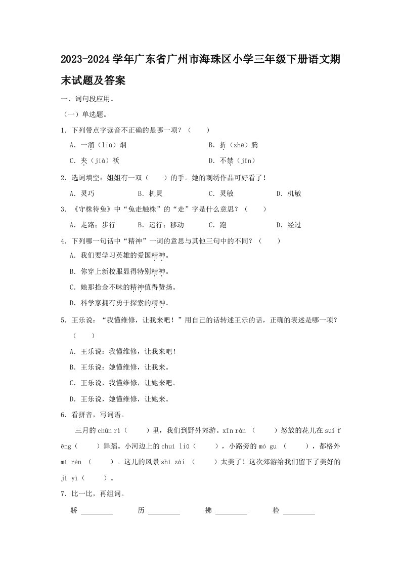 2023-2024学年广东省广州市海珠区小学三年级下册语文期末试题及答案(Word版)_共8页