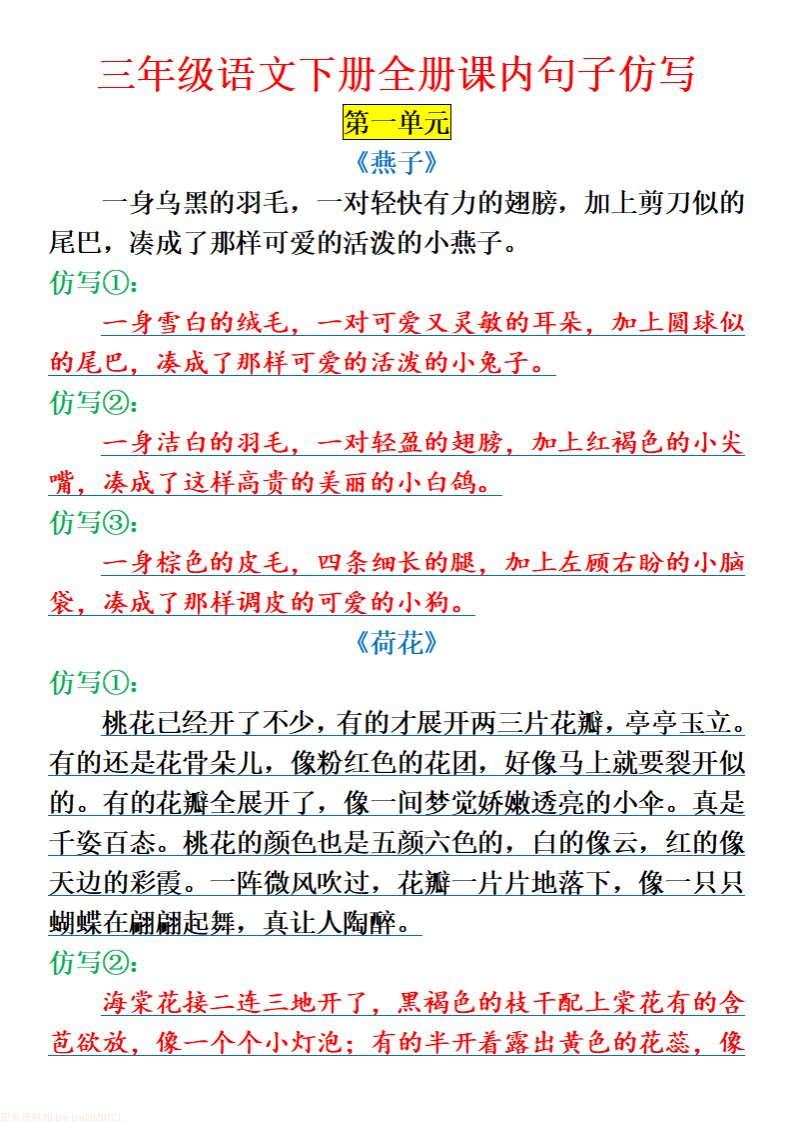 当前位置: 首页小学资源小学三年级正文 三下语文全册课内句子仿写_共6页 小学三年级 1 周前 0 0 5 以上为部分内容预览,如需源文档请登录您的会员账号进行下载! 声明:本站所有文章,如无特殊说明或标注,均为本站原创发布。任何个人或组织,在未征得本站同意时,禁止复制、盗用、采集、发布本站内容到任何网站、书籍等各类媒体平台。如若本站内容侵犯了原著者的合法权益,可联系我们进行处理。 尚学资源永久会员 打赏 收藏 海报 链接