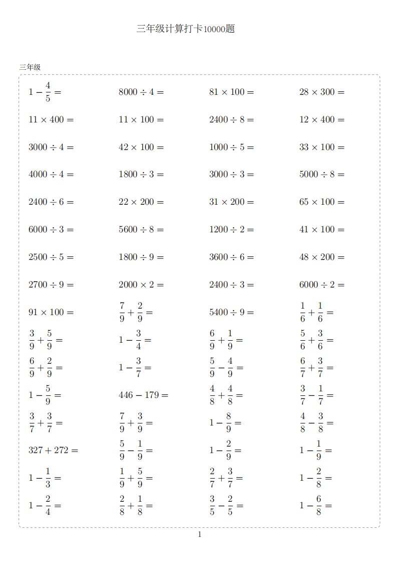 当前位置: 首页小学资源小学三年级正文 三年级下数学计算10000题_共110页 小学三年级 1 周前 0 0 15 以上为部分内容预览,如需源文档请登录您的会员账号进行下载! 声明:本站所有文章,如无特殊说明或标注,均为本站原创发布。任何个人或组织,在未征得本站同意时,禁止复制、盗用、采集、发布本站内容到任何网站、书籍等各类媒体平台。如若本站内容侵犯了原著者的合法权益,可联系我们进行处理。 尚学资源永久会员 打赏 收藏 海报 链接