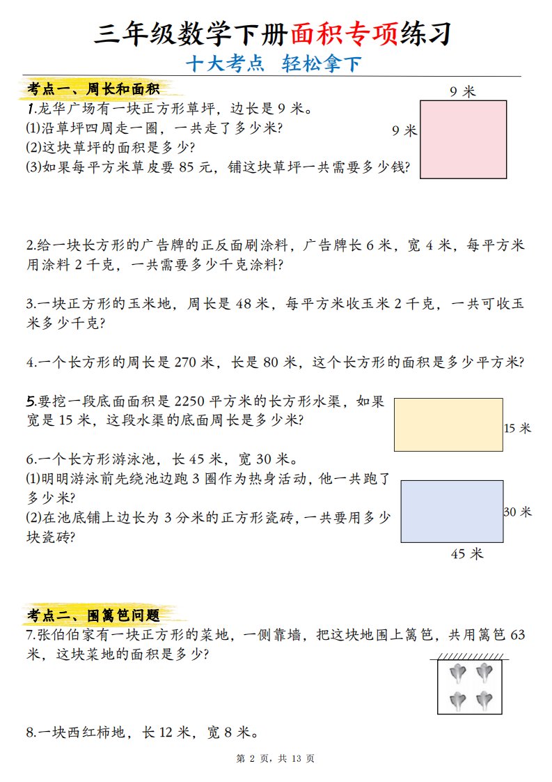 三下数学面积公式汇总+面积十大考点专项练习(含答案13页)_共13页