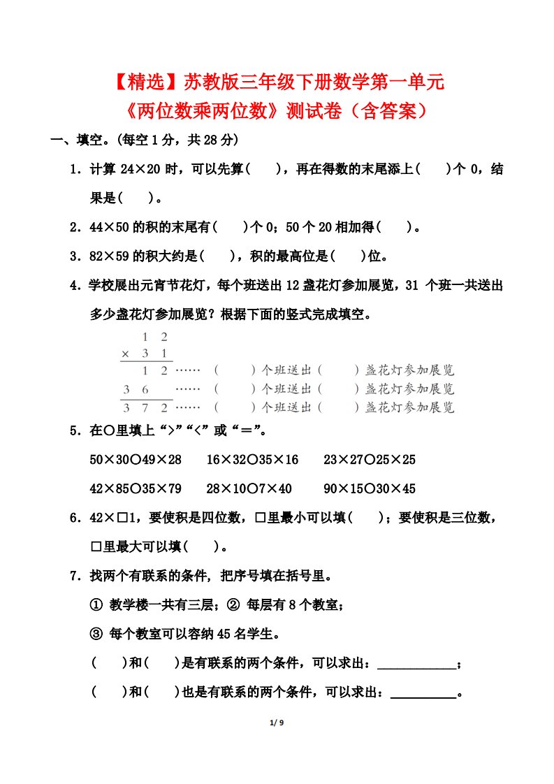 当前位置: 首页小学资源小学三年级正文 苏教版三年级下册数学第一单元《两位数乘两位数》测试卷(含答案)_共9页 小学三年级 1 周前 0 0 5 以上为部分内容预览,如需源文档请登录您的会员账号进行下载! 声明:本站所有文章,如无特殊说明或标注,均为本站原创发布。任何个人或组织,在未征得本站同意时,禁止复制、盗用、采集、发布本站内容到任何网站、书籍等各类媒体平台。如若本站内容侵犯了原著者的合法权益,可联系我们进行处理。 尚学资源永久会员 打赏 收藏 海报 链接