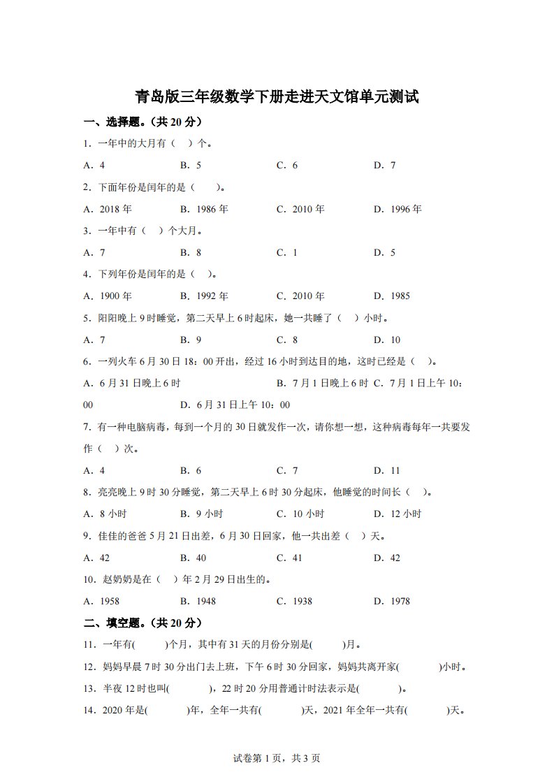 青岛63版数学三年级下册第六单元《走进天文馆》单元测试卷_共12页