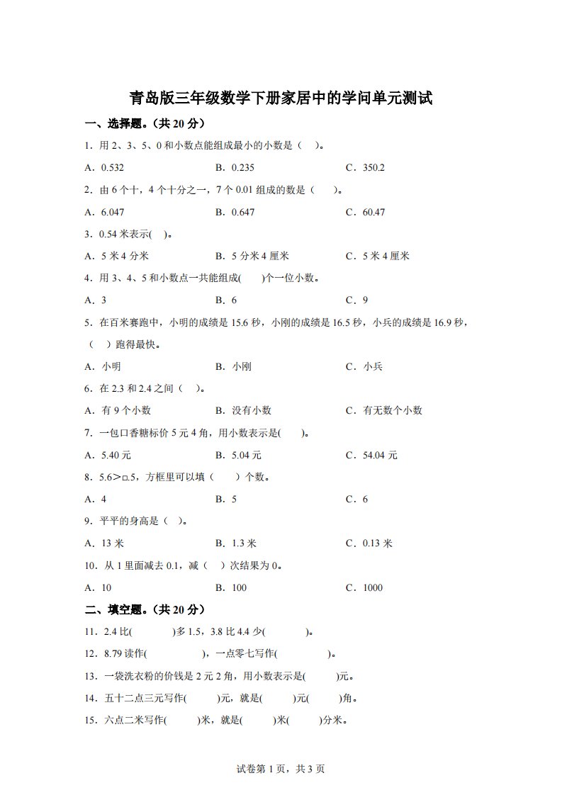 青岛63版数学三年级下册第七单元《家居中的学问》单元测试卷_共11页