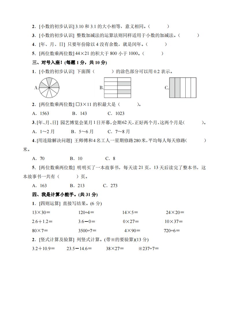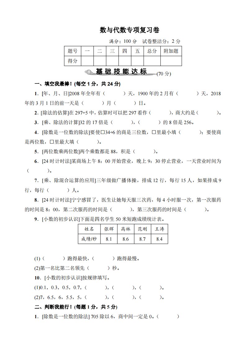 【专项】三下数学数与代数专项复习卷_共7页