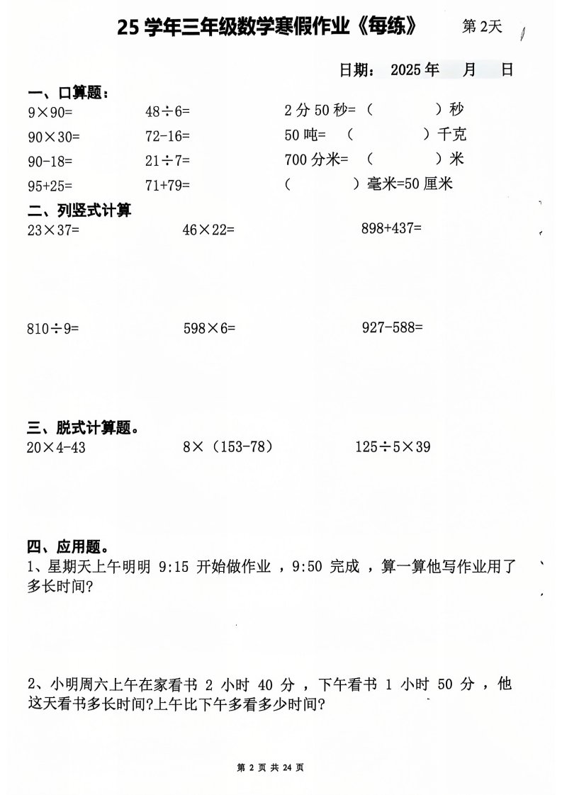三下数学寒假作业每日一练20天(含答案24页)_共24页