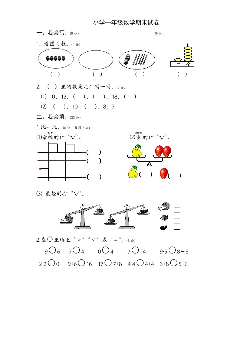 一年级数学上册期末试题(1)(苏教版)_共4页