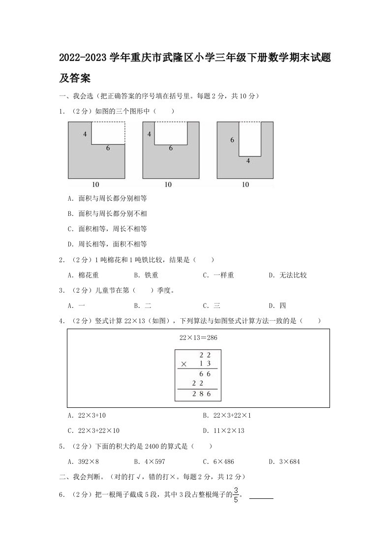当前位置: 首页小学资源小学三年级正文 2022-2023学年重庆市武隆区小学三年级下册数学期末试题及答案(Word版)_共13页 小学三年级 1 周前 0 0 10 以上为部分内容预览,如需源文档请登录您的会员账号进行下载! 声明:本站所有文章,如无特殊说明或标注,均为本站原创发布。任何个人或组织,在未征得本站同意时,禁止复制、盗用、采集、发布本站内容到任何网站、书籍等各类媒体平台。如若本站内容侵犯了原著者的合法权益,可联系我们进行处理。 尚学资源永久会员 打赏 收藏 海报 链接