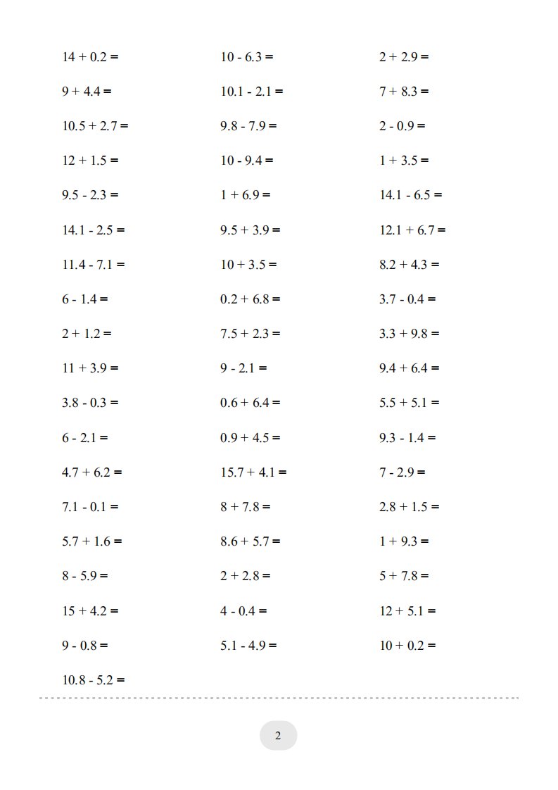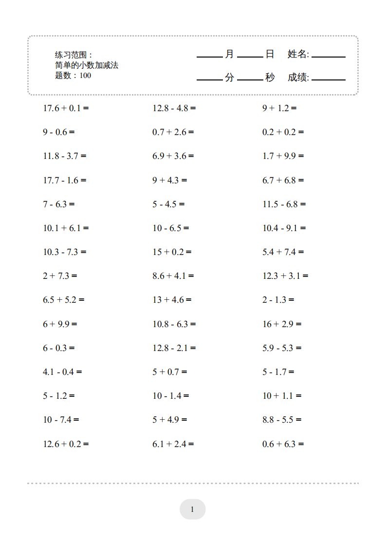 三年级数学下册口算题(简单的小数加减法)1000题(人教版)_共20页