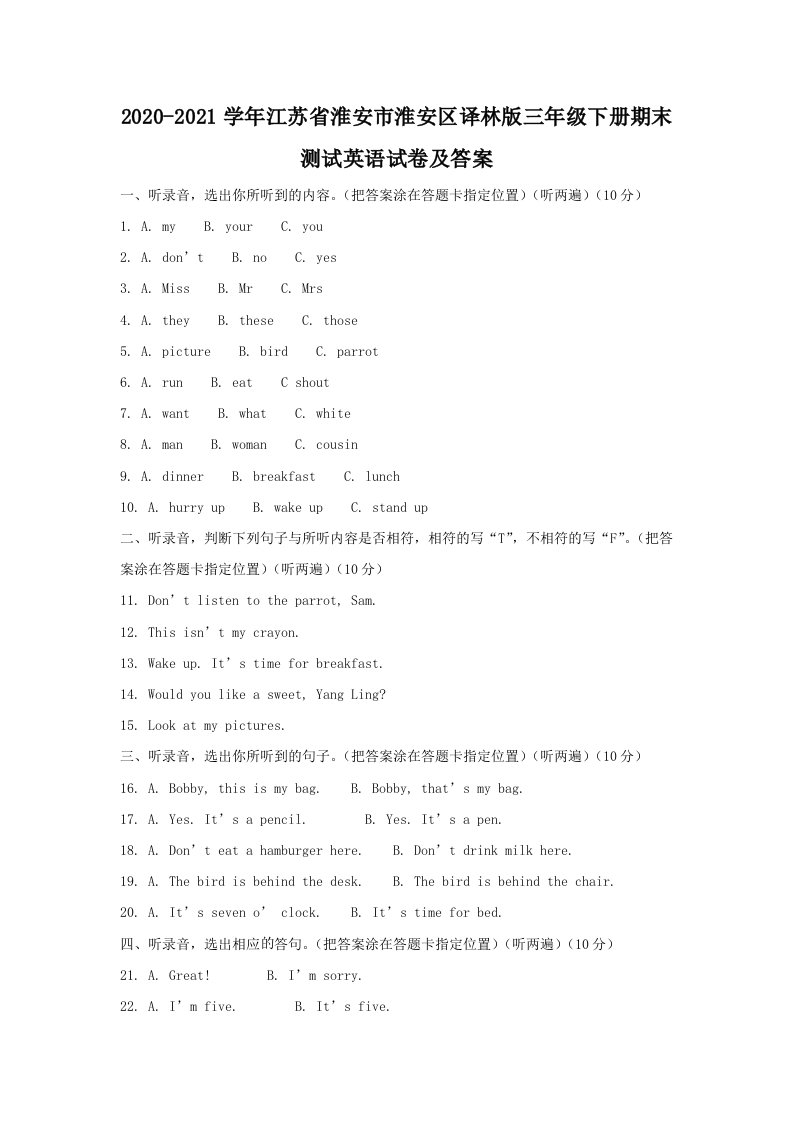 当前位置: 首页小学资源小学三年级正文 2020-2021学年江苏省淮安市淮安区译林版三年级下册期末测试英语试卷及答案(Word版)_共12页 小学三年级 7 天前 0 0 10 以上为部分内容预览,如需源文档请登录您的会员账号进行下载! 声明:本站所有文章,如无特殊说明或标注,均为本站原创发布。任何个人或组织,在未征得本站同意时,禁止复制、盗用、采集、发布本站内容到任何网站、书籍等各类媒体平台。如若本站内容侵犯了原著者的合法权益,可联系我们进行处理。 尚学资源永久会员 打赏 收藏 海报 链接