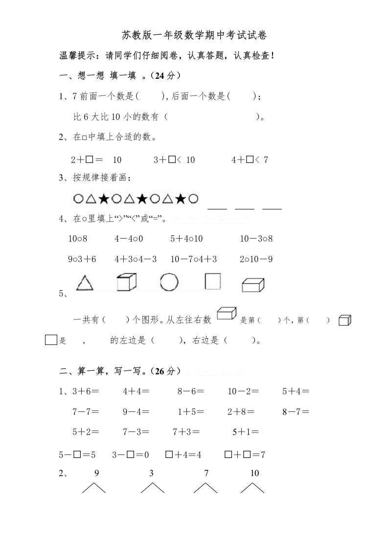 一年级数学上册期中试题(8)(苏教版)_共4页