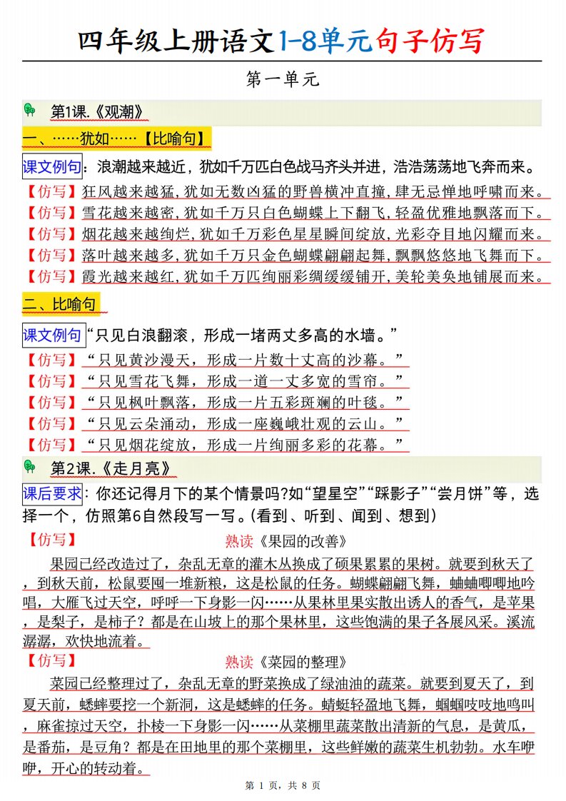 当前位置: 首页小学资源小学四年级正文 四上语文1-8单元句子仿写(8页)_共8页 小学四年级 1 周前 0 0 5 以上为部分内容预览,如需源文档请登录您的会员账号进行下载! 声明:本站所有文章,如无特殊说明或标注,均为本站原创发布。任何个人或组织,在未征得本站同意时,禁止复制、盗用、采集、发布本站内容到任何网站、书籍等各类媒体平台。如若本站内容侵犯了原著者的合法权益,可联系我们进行处理。 尚学资源永久会员 打赏 收藏 海报 链接