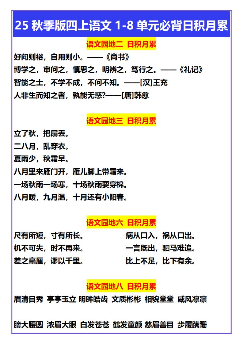 当前位置: 首页小学资源小学四年级正文 【2025秋新版】四年级上册语文1-8单元必背日积月累_共2页 小学四年级 1 周前 0 0 5 以上为部分内容预览,如需源文档请登录您的会员账号进行下载! 声明:本站所有文章,如无特殊说明或标注,均为本站原创发布。任何个人或组织,在未征得本站同意时,禁止复制、盗用、采集、发布本站内容到任何网站、书籍等各类媒体平台。如若本站内容侵犯了原著者的合法权益,可联系我们进行处理。 尚学资源永久会员 打赏 收藏 海报 链接