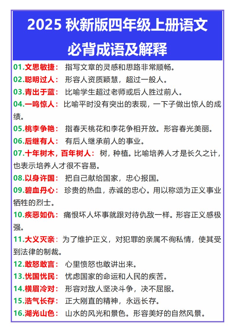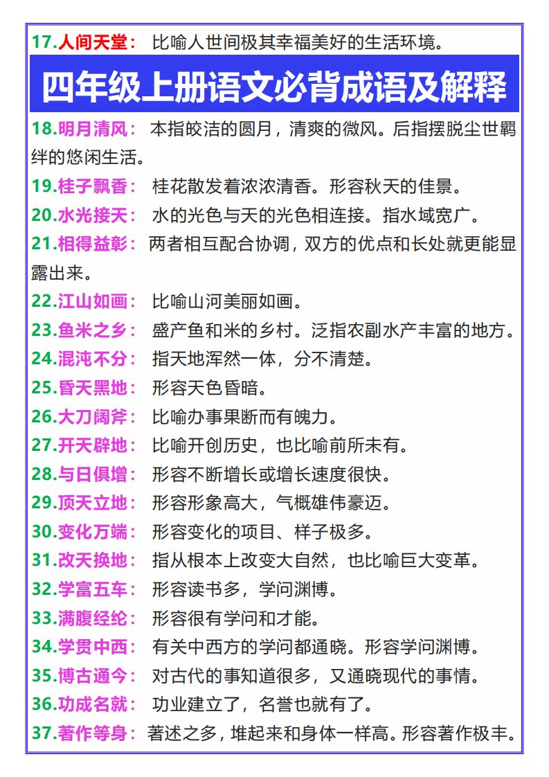 【2025秋新版】四年级上册语文必背成语及解释_共4页