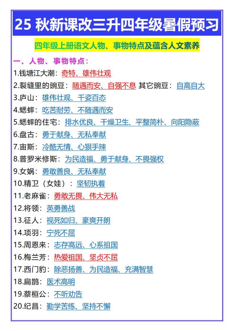 当前位置: 首页小学资源小学四年级正文 【2025秋新版】四年级上册语文人物、事物特点及蕴含人文素养_共3页 小学四年级 1 周前 0 0 5 以上为部分内容预览,如需源文档请登录您的会员账号进行下载! 声明:本站所有文章,如无特殊说明或标注,均为本站原创发布。任何个人或组织,在未征得本站同意时,禁止复制、盗用、采集、发布本站内容到任何网站、书籍等各类媒体平台。如若本站内容侵犯了原著者的合法权益,可联系我们进行处理。 尚学资源永久会员 打赏 收藏 海报 链接