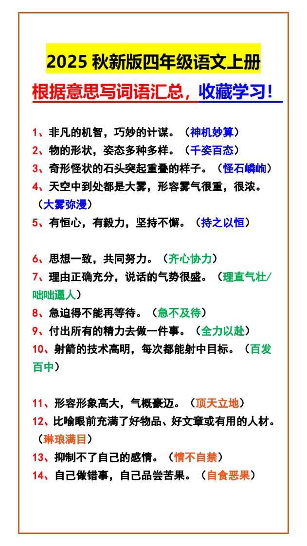 当前位置: 首页小学资源小学四年级正文 【2025秋新版】四年级语文上册根据意思写词语汇总,收藏学习!_共6页 小学四年级 1 周前 0 0 5 以上为部分内容预览,如需源文档请登录您的会员账号进行下载! 声明:本站所有文章,如无特殊说明或标注,均为本站原创发布。任何个人或组织,在未征得本站同意时,禁止复制、盗用、采集、发布本站内容到任何网站、书籍等各类媒体平台。如若本站内容侵犯了原著者的合法权益,可联系我们进行处理。 尚学资源永久会员 打赏 收藏 海报 链接