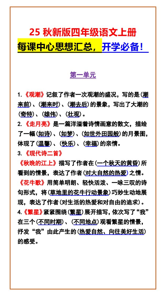 当前位置: 首页小学资源小学四年级正文 【2025秋新版】四年级语文上册每课中心思想汇总,开学必备!_共7页 小学四年级 1 周前 0 0 5 以上为部分内容预览,如需源文档请登录您的会员账号进行下载! 声明:本站所有文章,如无特殊说明或标注,均为本站原创发布。任何个人或组织,在未征得本站同意时,禁止复制、盗用、采集、发布本站内容到任何网站、书籍等各类媒体平台。如若本站内容侵犯了原著者的合法权益,可联系我们进行处理。 尚学资源永久会员 打赏 收藏 海报 链接