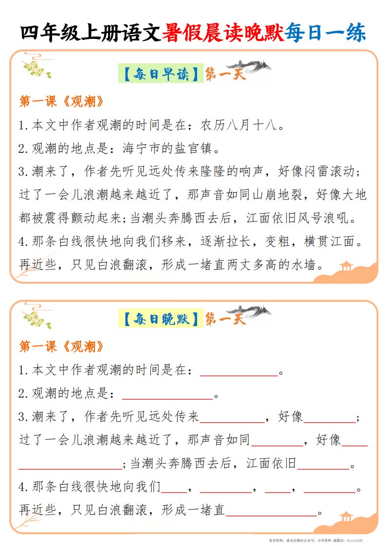 当前位置: 首页小学资源小学四年级正文 四上语文暑假晨读晚默每日一练20天(20页)_共20页 小学四年级 1 周前 0 0 10 以上为部分内容预览,如需源文档请登录您的会员账号进行下载! 声明:本站所有文章,如无特殊说明或标注,均为本站原创发布。任何个人或组织,在未征得本站同意时,禁止复制、盗用、采集、发布本站内容到任何网站、书籍等各类媒体平台。如若本站内容侵犯了原著者的合法权益,可联系我们进行处理。 尚学资源永久会员 打赏 收藏 海报 链接